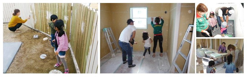 壁の石膏を一緒に塗ったり、外構の塗装をしたり、お施主様ご家族と二宮工務店の担当者や職人達が一緒に創り上げた家に、